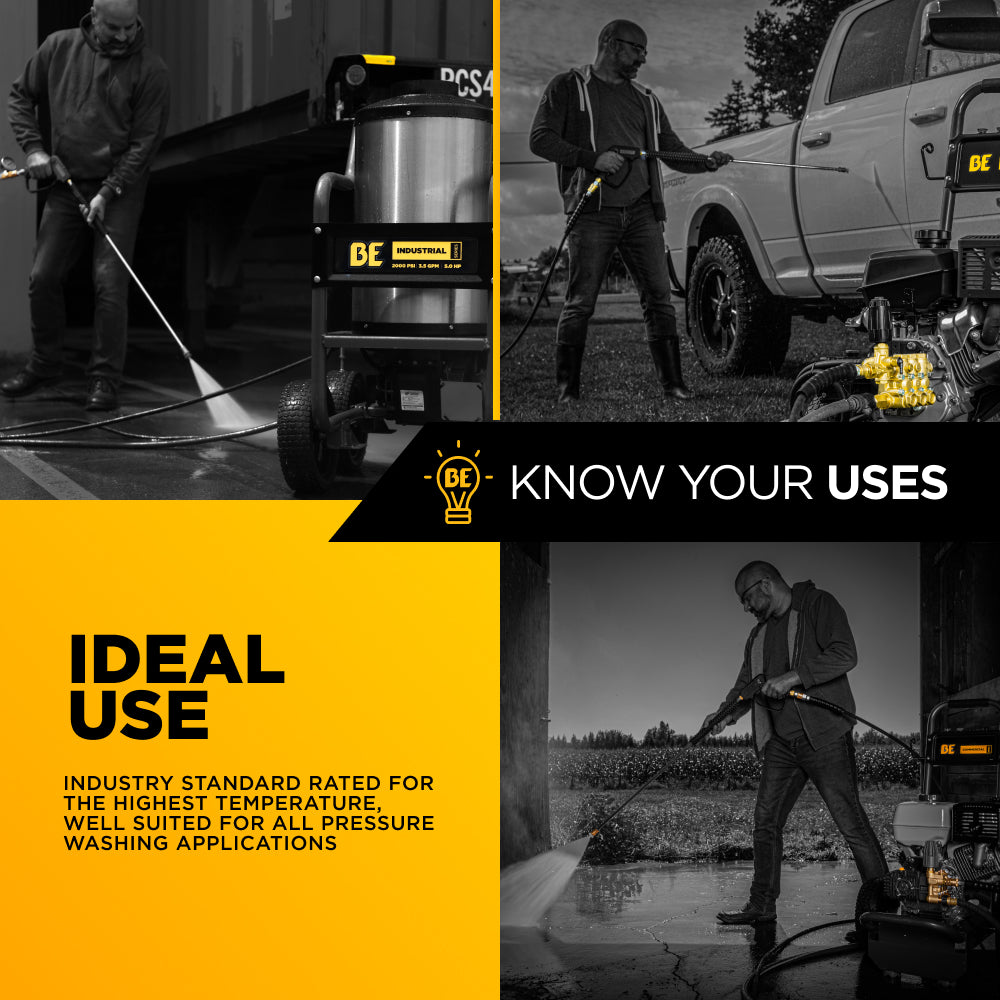 A power washer works by drawing water from a connected hose and pumping it through a high pressure nozzle. The gas engine powers the pump which pressurizes the water and then expels it through the nozzle at high speed to clean the surface. The water pressure is measured in PSI (pounds per square inch) and the flow rate is measured in GPM (gallons per minute).Many models also feature adjustable water pressure settings to cater to different cleaning needs. BE makes pressure washing easy with models available for light jobs and heavy duty commercial cleaning projects.