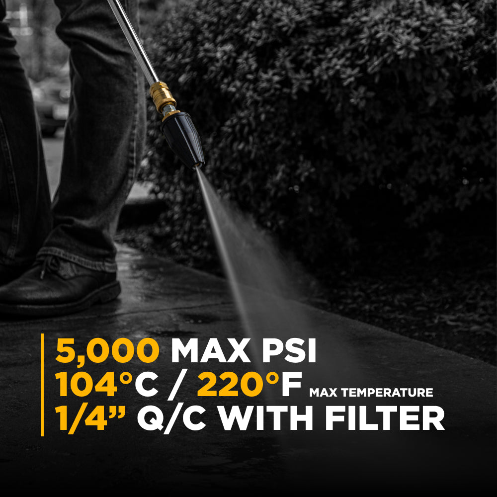 Un filtre à eau en ligne protège le système des contaminants présents dans l’eau tandis que le jet circulaire maximise la pression et nettoie plus rapidement qu’une buse ordinaire.