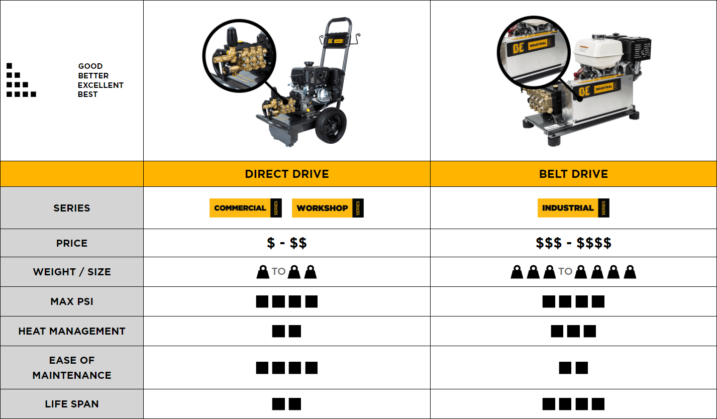A "Belt Drive" pump has a pulley mounted to its solid shaft and is driven by one of more belts that are attached to a pulley on the motor or engine. The pulley system allows these pumps to turn at a much lower RPM than a direct drive pump (typically 900-1740 RPM). The belt drive pump crankcase has a larger oil capacity. This, combined with the lower RPM of the belt drive pump, allows the pump to run much cooler than a direct drive pump.