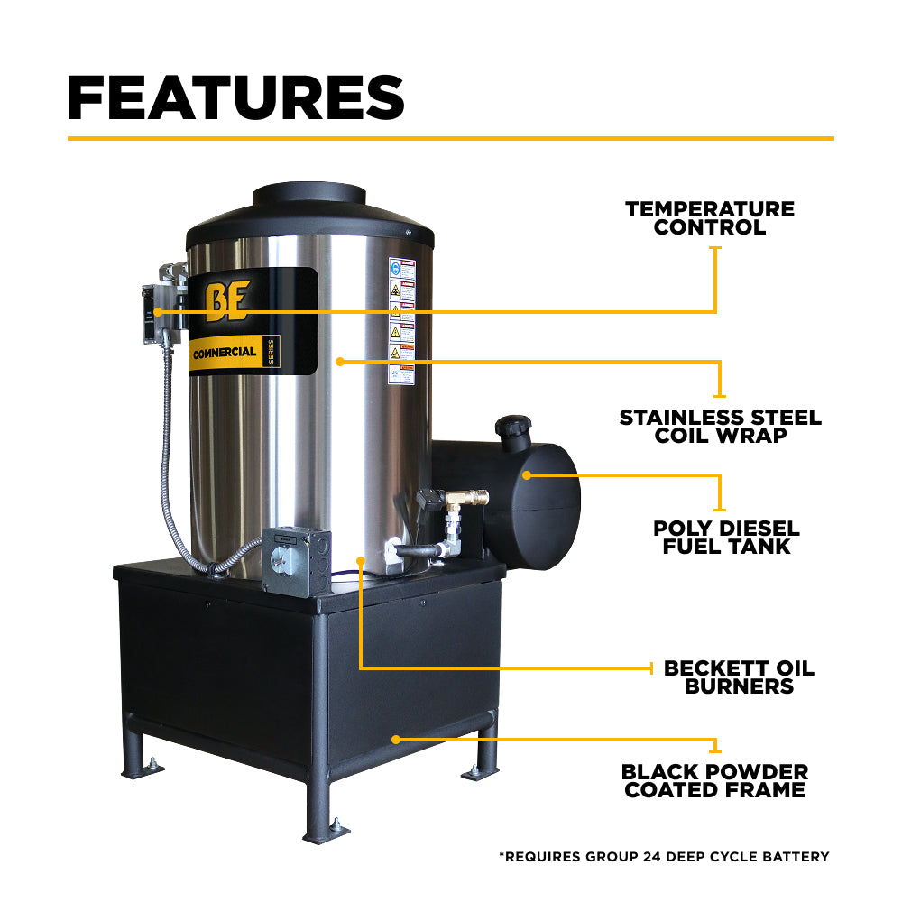 Introducing our 96012V Vertical Electric Ignition Diesel Fired Hot Box, the ultimate solution for on-demand hot water. Designed to seamlessly connect with your cold water pressure washer, this innovative hot box heats water to your desired temperature, ensuring efficient and effective cleaning. With a robust 7-gallon poly fuel tank and a durable black powder-coated industrial-grade frame, this unit is built to withstand the rigors of any job site.