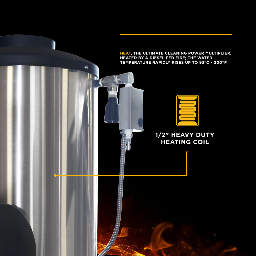 Equipped with advanced safety features such as a high limit switch, pressure relief valve, and thermal relief valve, you can operate with peace of mind. The stainless steel coil wrapper and Sch. 80 black pipe heating coil ensure optimal heat transfer and longevity. For 115VAC units, enjoy the convenience of a 15 Amp GFCI with a 35' cord, while 12VDC units feature a PAC in-line thermostat for precise temperature control. Elevate your cleaning capabilities with our Hot Box today!