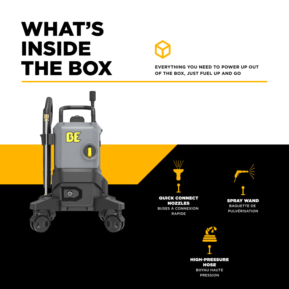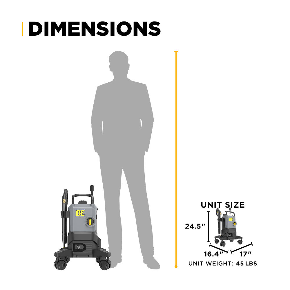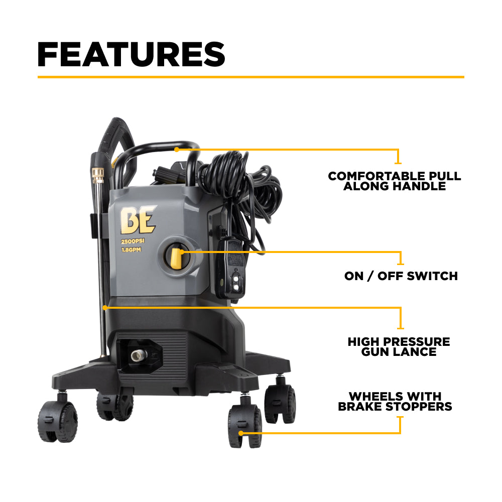 The BE 2,500 PSI 1.8 GPM Electric Pressure Washer brings together strong pressure performance, a quiet and efficient motor, and reliable components in one durable, compact unit. Whether you’re a homeowner looking for the best value for cleaning around the house or a professional needing dependable electric performance for lighter jobs, this pressure washer delivers.