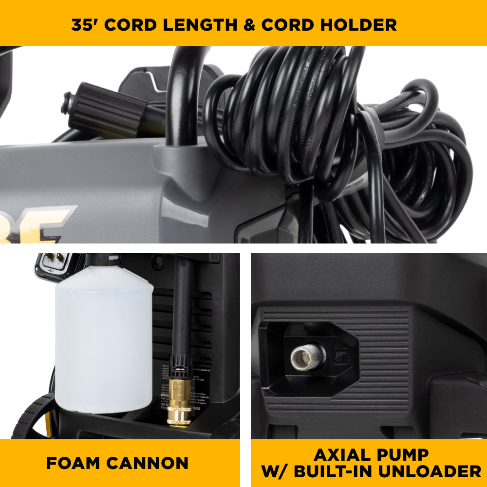 Mobility, control, and safety are built into this electric pressure washer. The pull-along handle design makes it easy to move from task to task, while the rear wheels are built with brake stoppers to keep the unit securely in place during use. The on/off switch is easy to reach, and users will appreciate the convenient access to controls, nozzle storage, and the detergent tank. The GFCI plug ensures protection when operating in damp environments.