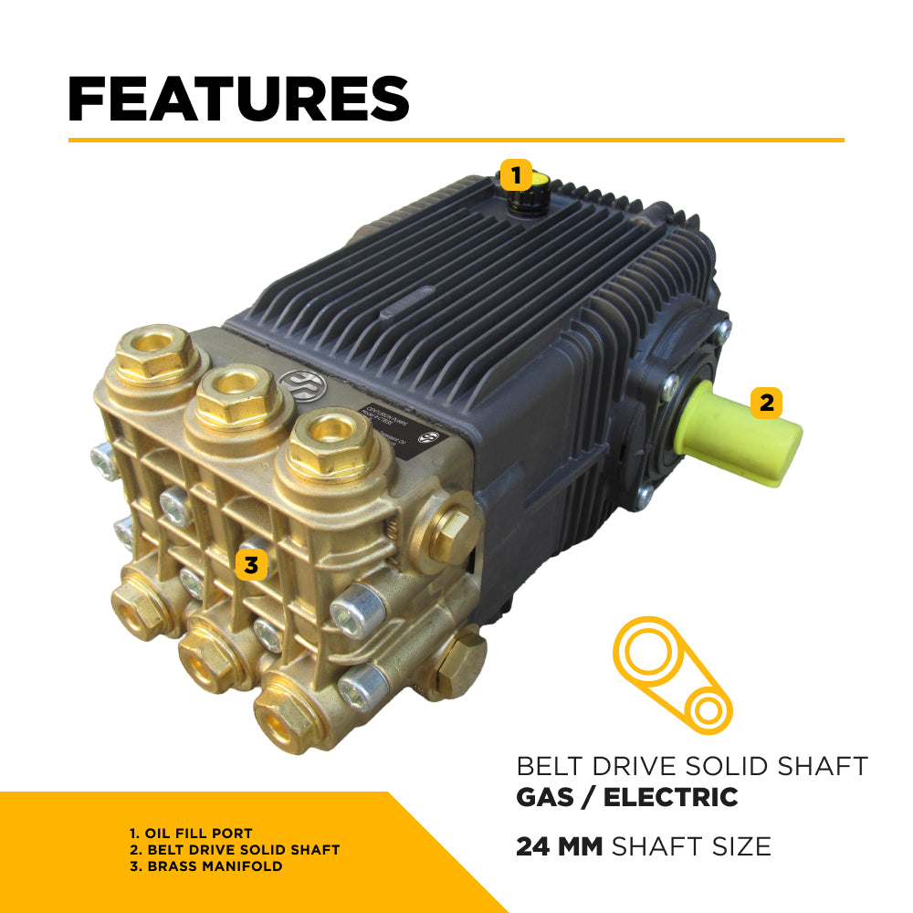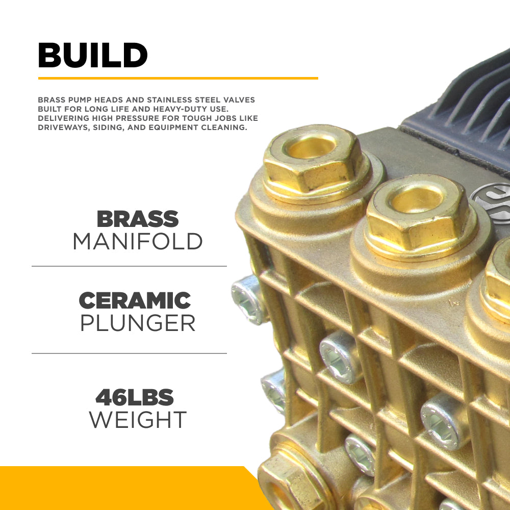 With a belt drive system, brass manifold, ceramic plungers, and an external unloader, the Centurion P11 provides consistent high-pressure performance without the wear, vibration, or overheating that plague standard direct-drive pumps. Whether paired with a gas or electric motor, the P11’s heavy-duty build and precision design make it the trusted heart of your professional cleaning system.