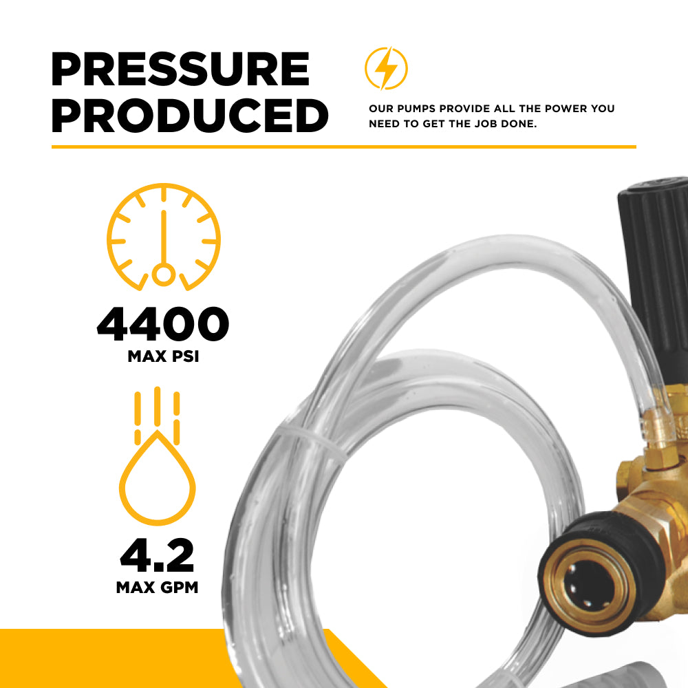 With 4,400 PSI of maximum pressure and a flow rate of 4.2 GPM, this pump delivers serious cleaning power. The high PSI rating blasts through stubborn dirt, oil, and paint, while the high flow rate ensures faster coverage on large surfaces. This combination makes the RSV4G40HD-F40EZ an excellent choice for industrial cleaning, construction, fleet maintenance, and large property jobs.