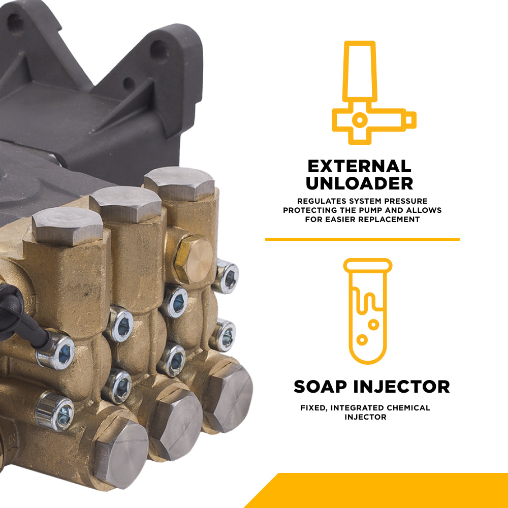 The triplex plunger design is the standard for professional pressure washer pumps, offering smoother operation, reduced vibration, and greater efficiency compared to axial designs. With three precision ceramic plungers, the RRV4G40D-F24 is engineered to withstand heat, abrasion, and heavy-duty use.