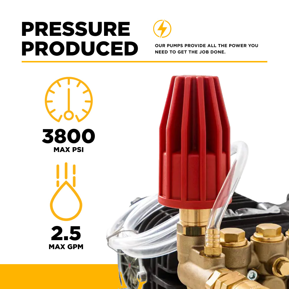 With a maximum output of 3,800 PSI at 2.5 GPM, this pump provides the cleaning power needed for tough jobs like paint stripping, surface preparation, heavy equipment washing, and industrial-grade property maintenance.