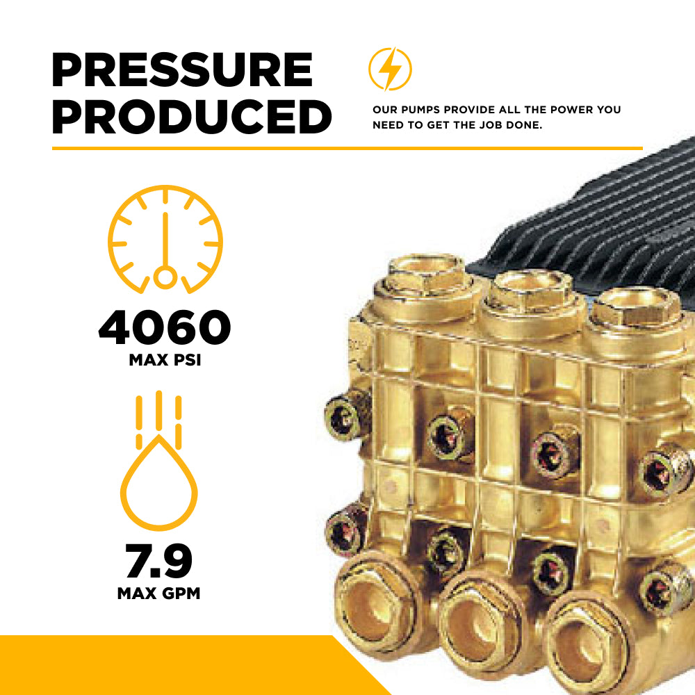 At 7.9 gallons per minute, this pump delivers the high water volume needed for large-scale cleaning projects, while its 4,060 PSI maximum pressure cuts through stubborn dirt, grime, grease, and coatings with ease. This combination of high flow and high pressure makes it one of the most versatile industrial-grade pumps available.