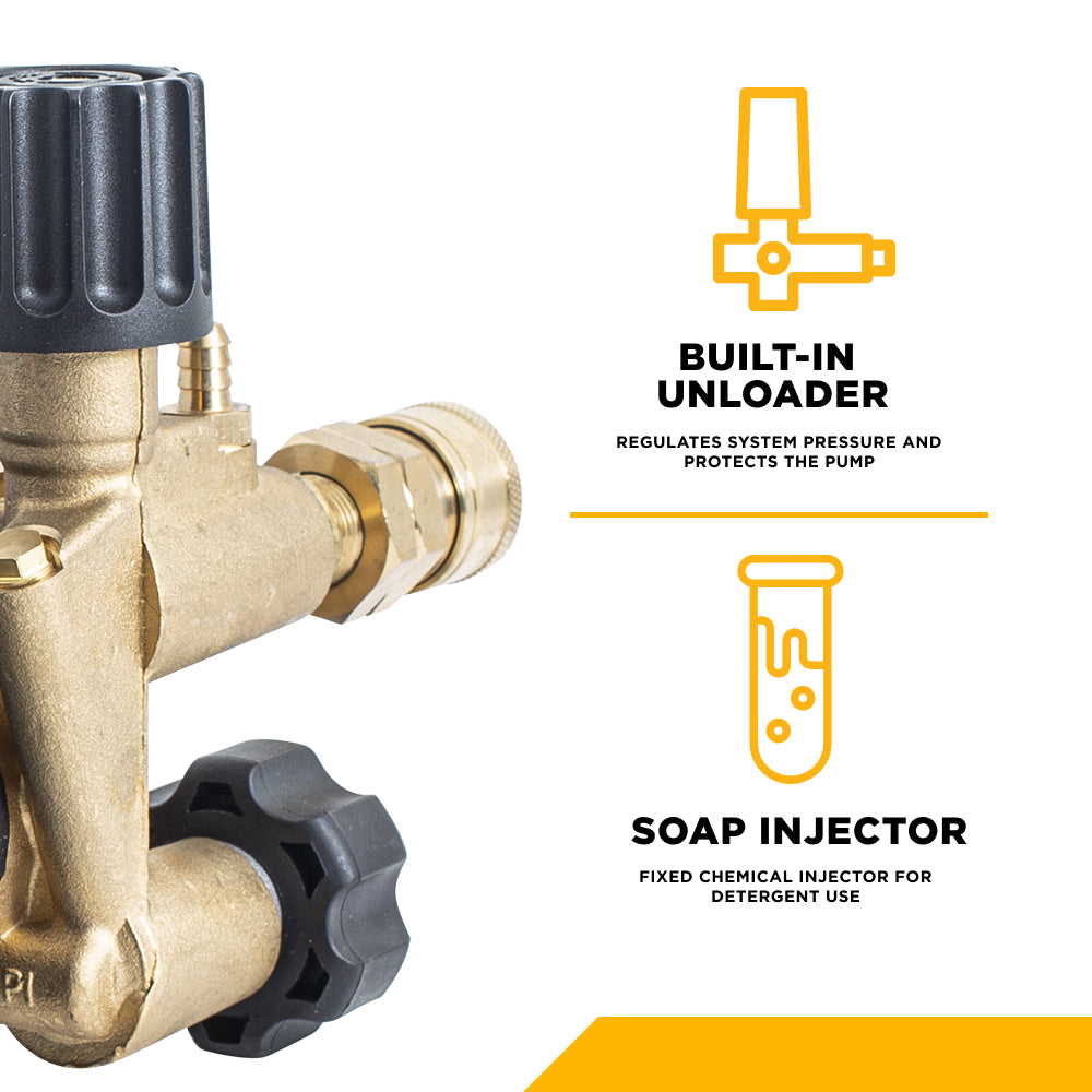 This pump has a built-in unloader which regulates water pressure and provides bypass functionality when the spray trigger is released. This makes operation safer and helps extend pump life by preventing pressure spikes.