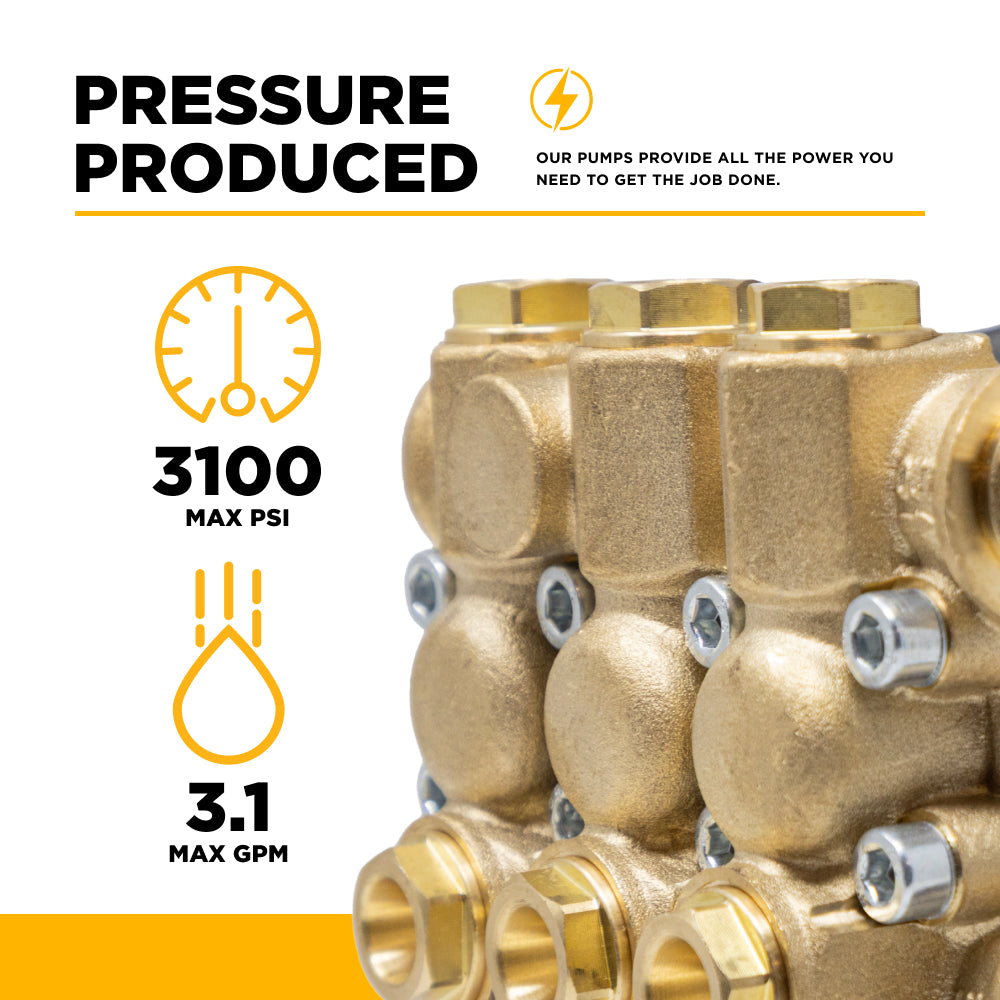 The Centurion P3+ packs high-impact cleaning power into a lightweight, versatile package. It's designed for use with 3450 RPM gas engines, and the direct drive triplex pump puts out 3,100 PSI and 3.1 GPM - making it perfect for medium to heavy-duty pressure washing.