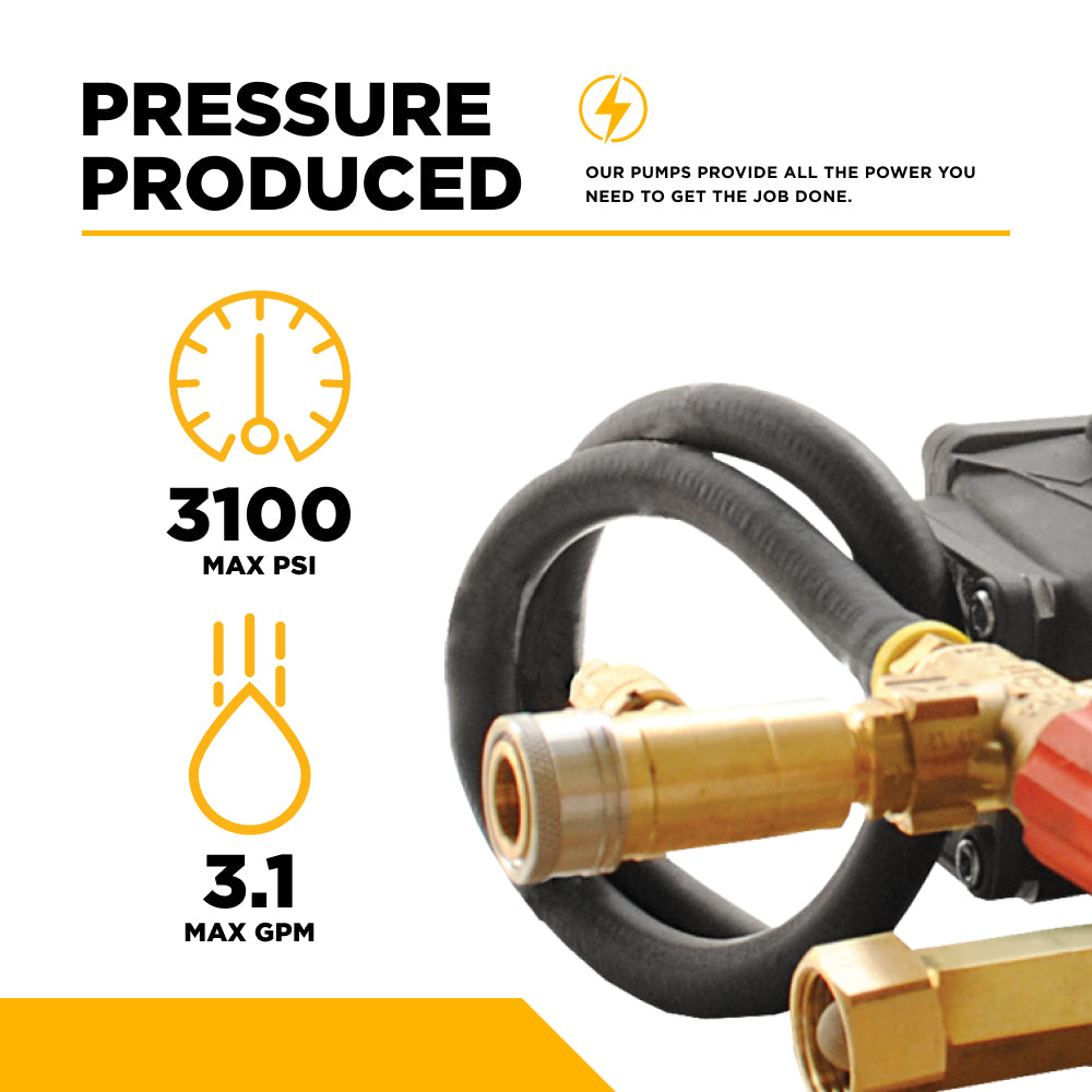 With an output of 3,100 PSI at 3.1 GPM this pump has the perfect balance of pressure and flow. The higher flow rate allows for faster coverage on larger surfaces, the higher pressure rating for effective dirt, stain and grime removal.