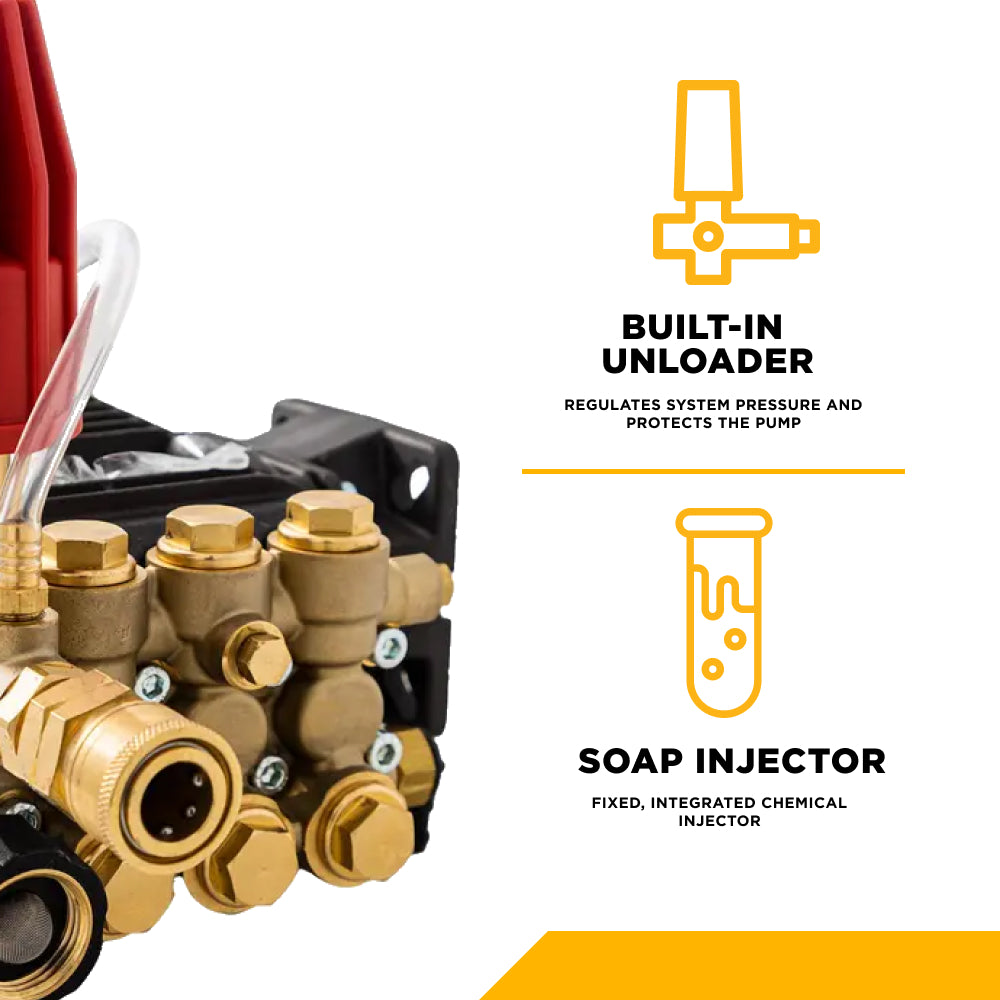 A fixed chemical injector is integrated into the system, making it easy to apply soaps, detergents, or degreasers when cleaning jobs require extra power. Simply switch to a low-pressure nozzle, and the injector automatically draws solution into the water stream.