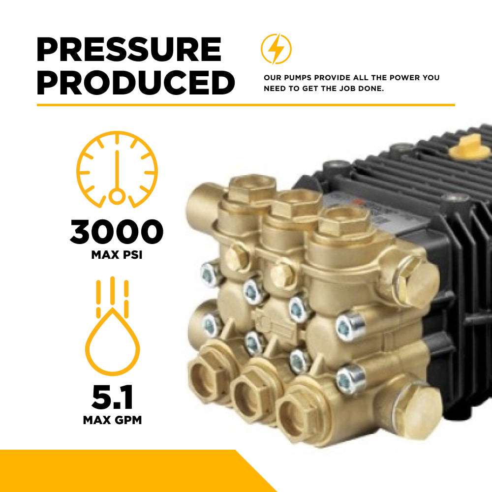 The Comet ZWD5030G has 5.1 GPM at 3,000 PSI, more flow than standard replacement pumps. This combination of flow and pressure gives great coverage for washing large surfaces fast, rinsing debris efficiently and powering through heavy duty cleaning jobs.