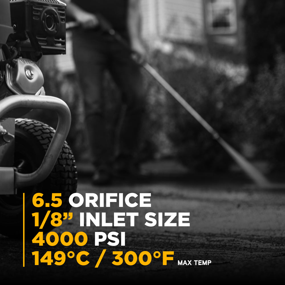 With a 6.5 orifice, 1/8” inlet, and maximum pressure rating of 4,000 PSI, this laser-style nozzle produces a direct, high-impact stream ideal for penetrating and breaking down the toughest obstructions. Built to handle water temperatures up to 149°C / 300°F, it performs flawlessly with both hot and cold water pressure washers, making it a reliable choice for residential, commercial, and industrial applications.