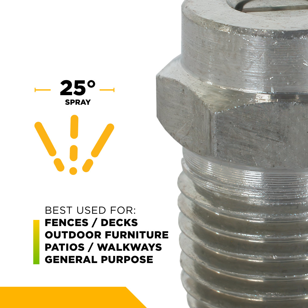 The 25° 1/4" MEG Spray Nozzle with 5.5 orifice is the most versatile in the MEG lineup, with the perfect balance of cleaning power and wide area coverage. With a 25-degree fan spray pattern it has more dirt cutting ability than narrower nozzles and covers more surface area than wider nozzles, making it the go to nozzle for everyday cleaning.