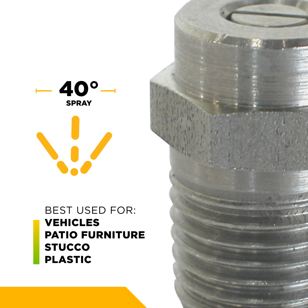 The 40° MEG nozzle is best suited for rinsing vehicles, washing siding, cleaning decks, fences, patios, and outdoor furniture. Compared to narrower nozzles, it provides the gentlest spray in the MEG lineup, protecting sensitive surfaces like automotive paint, wood, or vinyl siding while still delivering excellent cleaning efficiency. Its wide coverage helps reduce streaking, speeds up rinsing, and allows for safer cleaning of large or delicate surfaces.