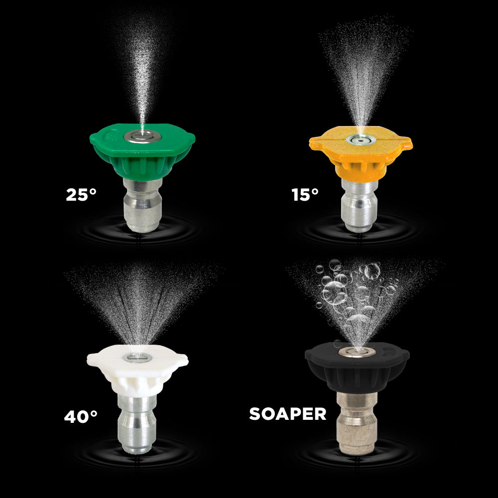 - Different nozzles (0°, 15°, 25°, 40°, and soap nozzle) to adjust spray patterns.