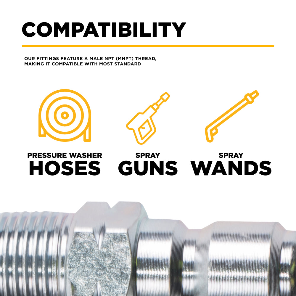 3/8" MNPT threading – standard size for pressure washer hoses, spray guns, and accessories.