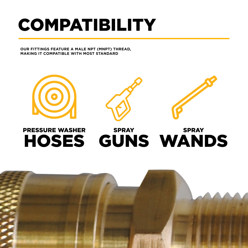 The Male M22 x 3/8" Quick Connect MNPT Coupler is designed to provide seamless compatibility between different pressure washer accessories, saving you time and effort. With a male M22 connection on one side and a 3/8" quick connect MNPT coupler on the other, this adapter makes it easy to connect hoses, spray guns, wands, and other attachments securely.