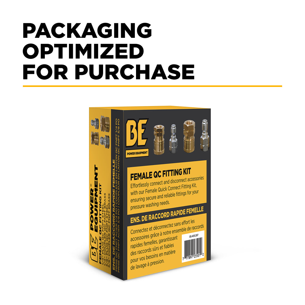 Constructed from premium-grade materials and designed to withstand high pressure, these fittings offer specific performance metrics and capabilities, making them ideal for both residential and commercial pressure washer systems. The components are corrosion-resistant, precision-machined, and compatible with virtually all gas and electric pressure washers using standard connection sizes. And with retail-ready packaging, this kit is ready for both online and in-store display.