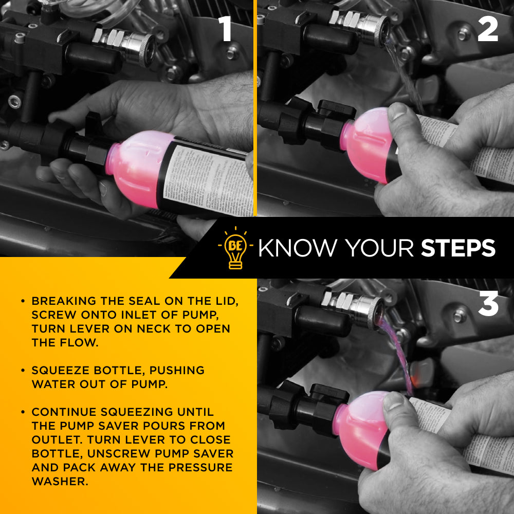 Winterizing your pressure washer with BE Pump Saver is fast and easy. Follow these simple steps: