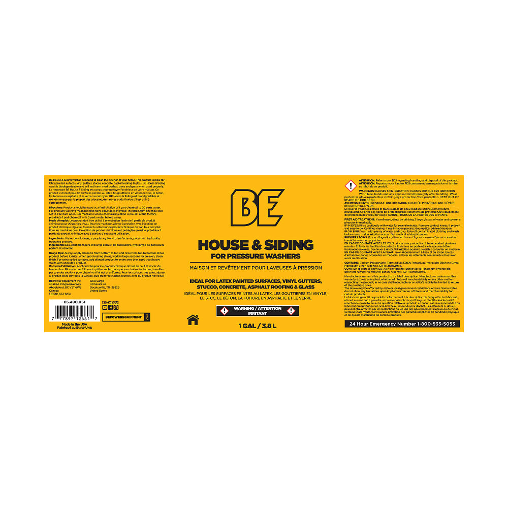 Give your home the deep clean it deserves with BE’s Pressure Washer House and Siding Detergent — a professional-grade cleaning solution and versatile cleaner for outdoor surfaces, designed to safely remove grime, mildew, dirt, and buildup from your home’s exterior surfaces. This 1-gallon concentrated detergent is specially formulated for use with pressure washer soap injection systems and delivers high-yield results with minimal effort.