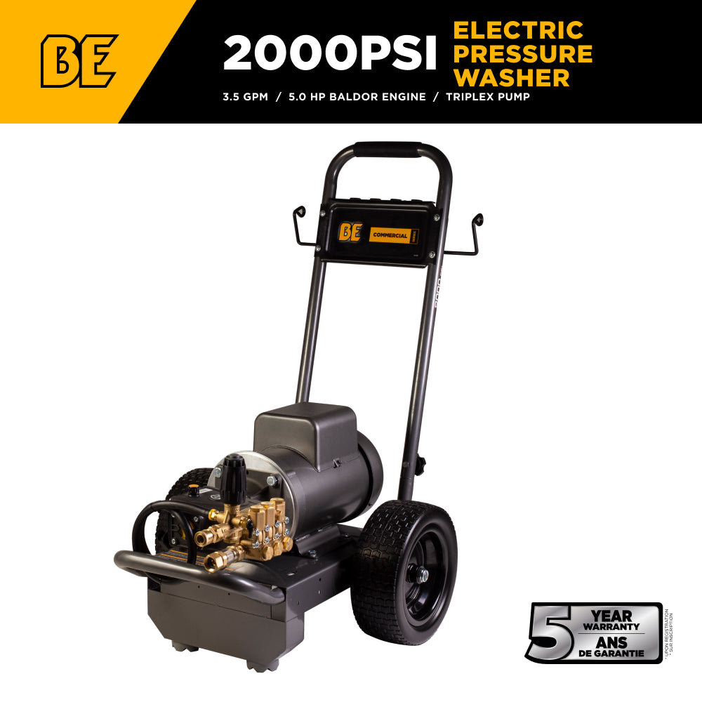 When you need serious cleaning power backed by professional-grade components, the BE Power Equipment B205EA delivers unmatched performance and long-term durability. Designed for industrial and commercial cleaning applications, this 2,000 PSI electric pressure washer offers the strength and reliability professionals demand, powered by a 5.0 HP Baldor electric motor and an AR commercial triplex pump.