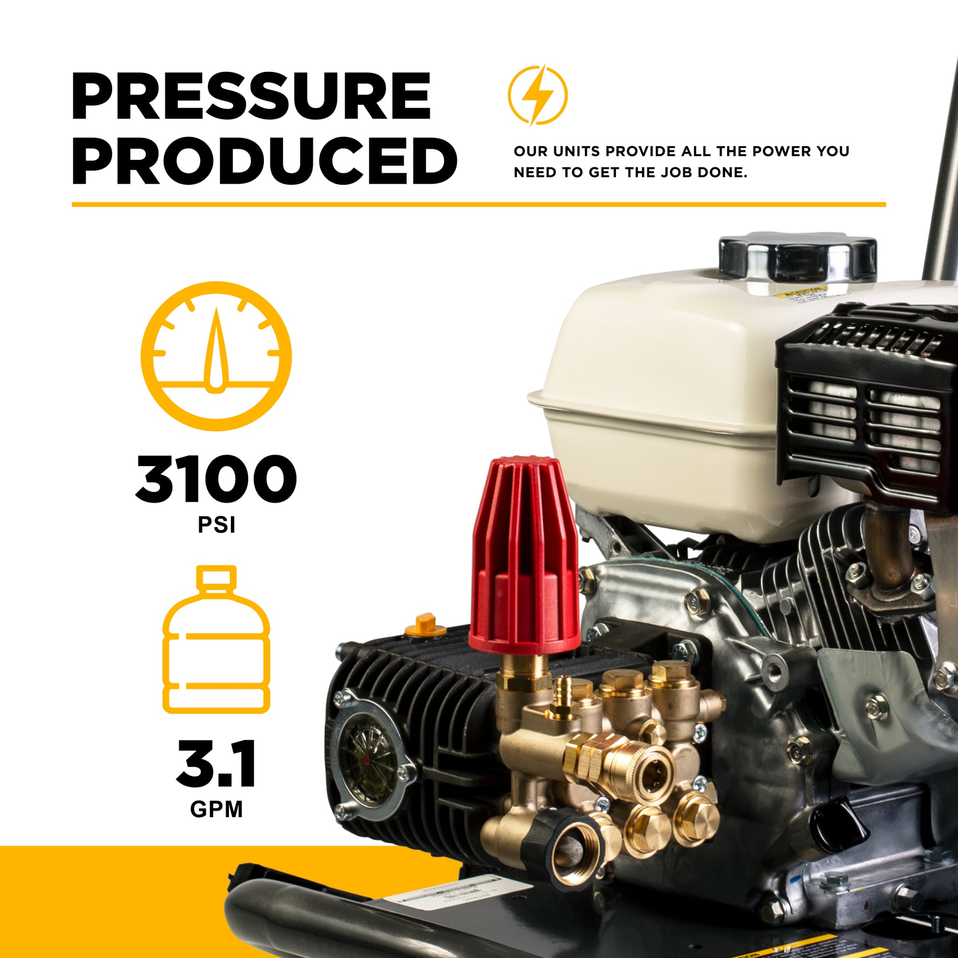 This pressure washer is driven by the Honda GX200, a 196cc engine widely regarded for its smooth operation, easy starting, low emissions, and proven reliability in commercial settings. It delivers consistent power to the pump, keeping output stable at 3,100 PSI and 3.1 GPM, so you get clean results every time.