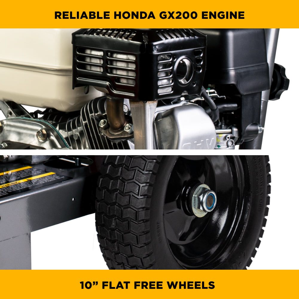 At its core is a Honda GX200 engine—renowned for dependability, fuel efficiency, and easy starting—paired with a commercial-grade Comet triplex pump that provides consistent output and long service life. The external unloader helps regulate pressure while protecting pump components under prolonged use. Built with a durable stainless steel frame and supported by 10” flat-free tires, this unit is rugged enough for job sites, garages, driveways, farms, and more.