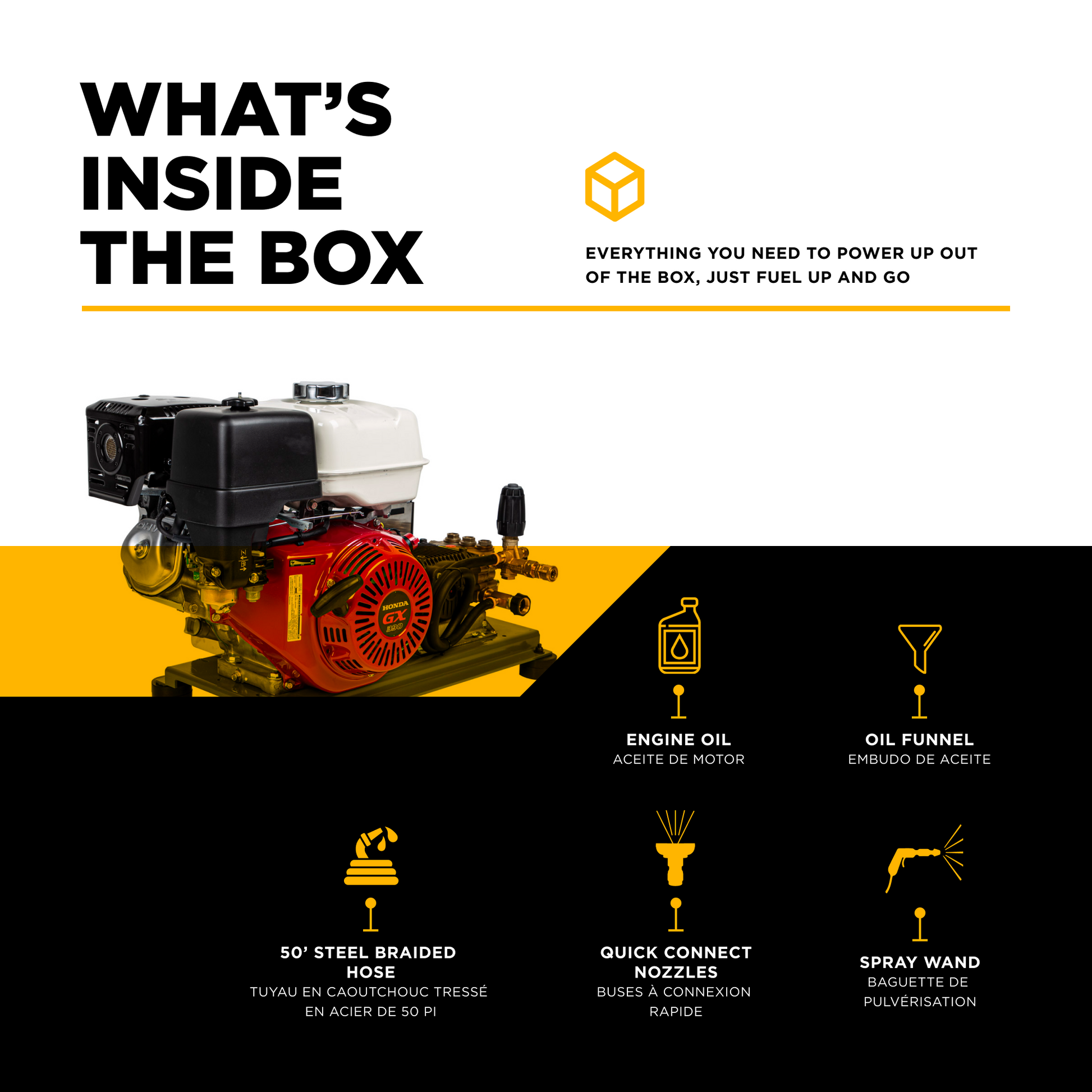 The large capacity fuel tank provides longer runtime, an automatic low oil shutdown shuts the engine off if your oil is low. Easily access hard-to-reach areas with the included 50 ft. steel braided high-pressure hose with quick-connect fittings.