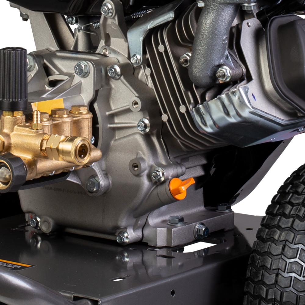 The large capacity fuel tank provides longer runtime, an automatic low oil shutdown shuts the engine off if your oil is low and a thermal relief valve on the pump that dumps built-up hot water if you happen to leave your pressure running and unattended. Featuring a durable, hand truck frame design and large 12 in. flat-free wheels, this pressure washer is designed for easy transport.