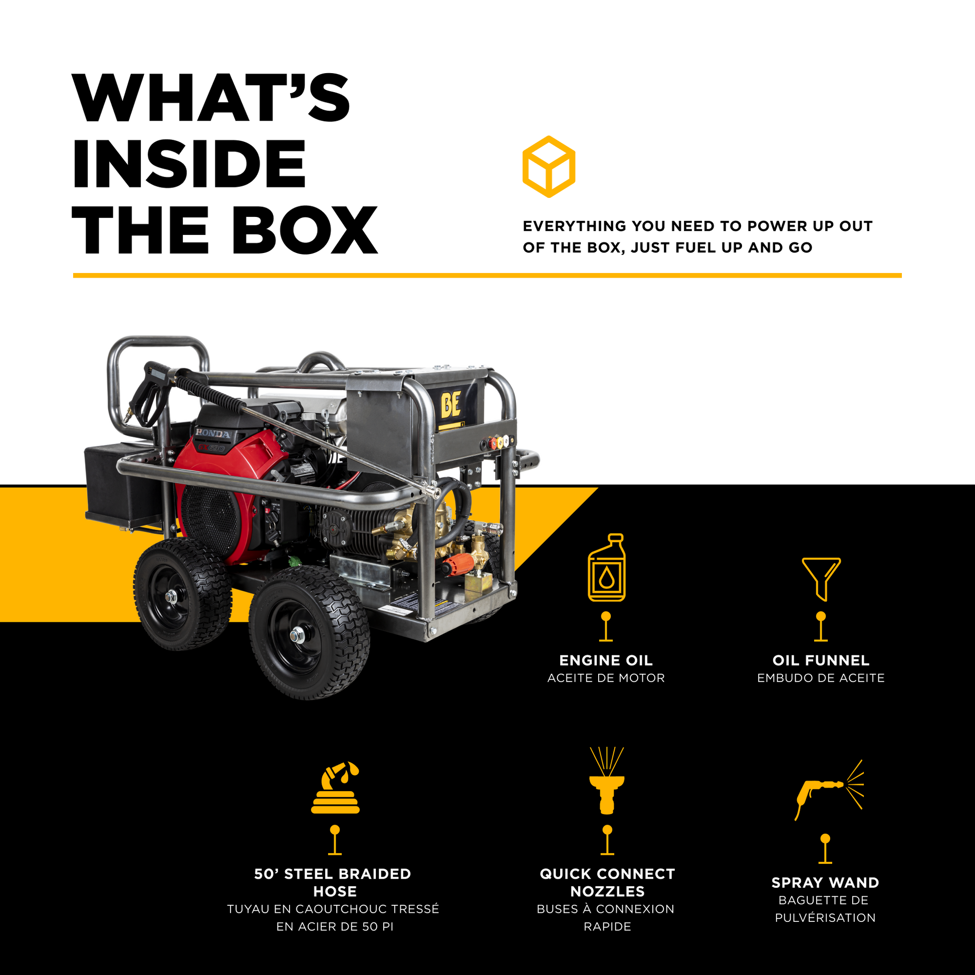 The large capacity fuel tank provides long runtime, an automatic low oil shutdown shuts the engine off if your oil is low. Easily access hard-to-reach areas with the included 50 ft. steel braided high-pressure hose with quick-connect fittings.