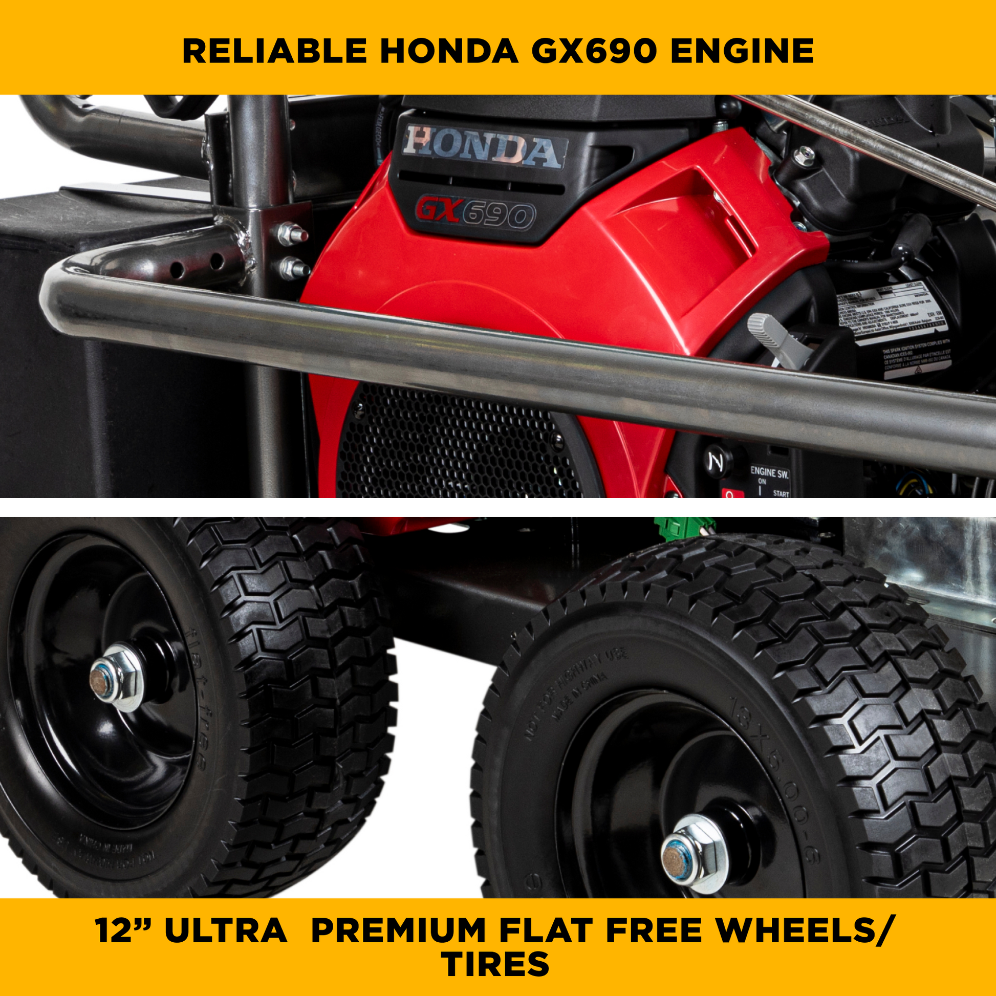 Powered by a Honda GX690 engine with electric start