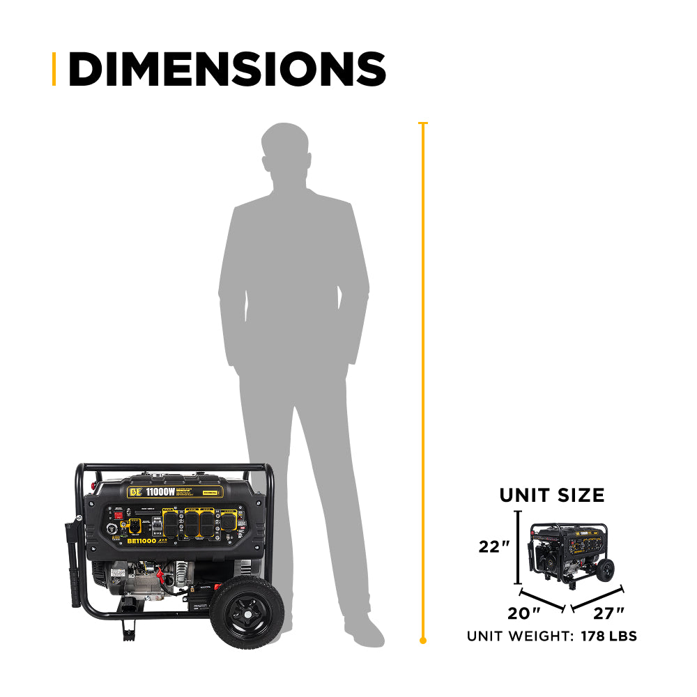 BE Power Equipment generators are built with operator safety and usability in mind. That’s why the BE11000 comes with automatic low oil shutdown to protect the engine from damage, and a carbon monoxide sensor to prevent dangerous exposure—making it safe for use around homes, worksites, and enclosed outdoor setups with proper ventilation.