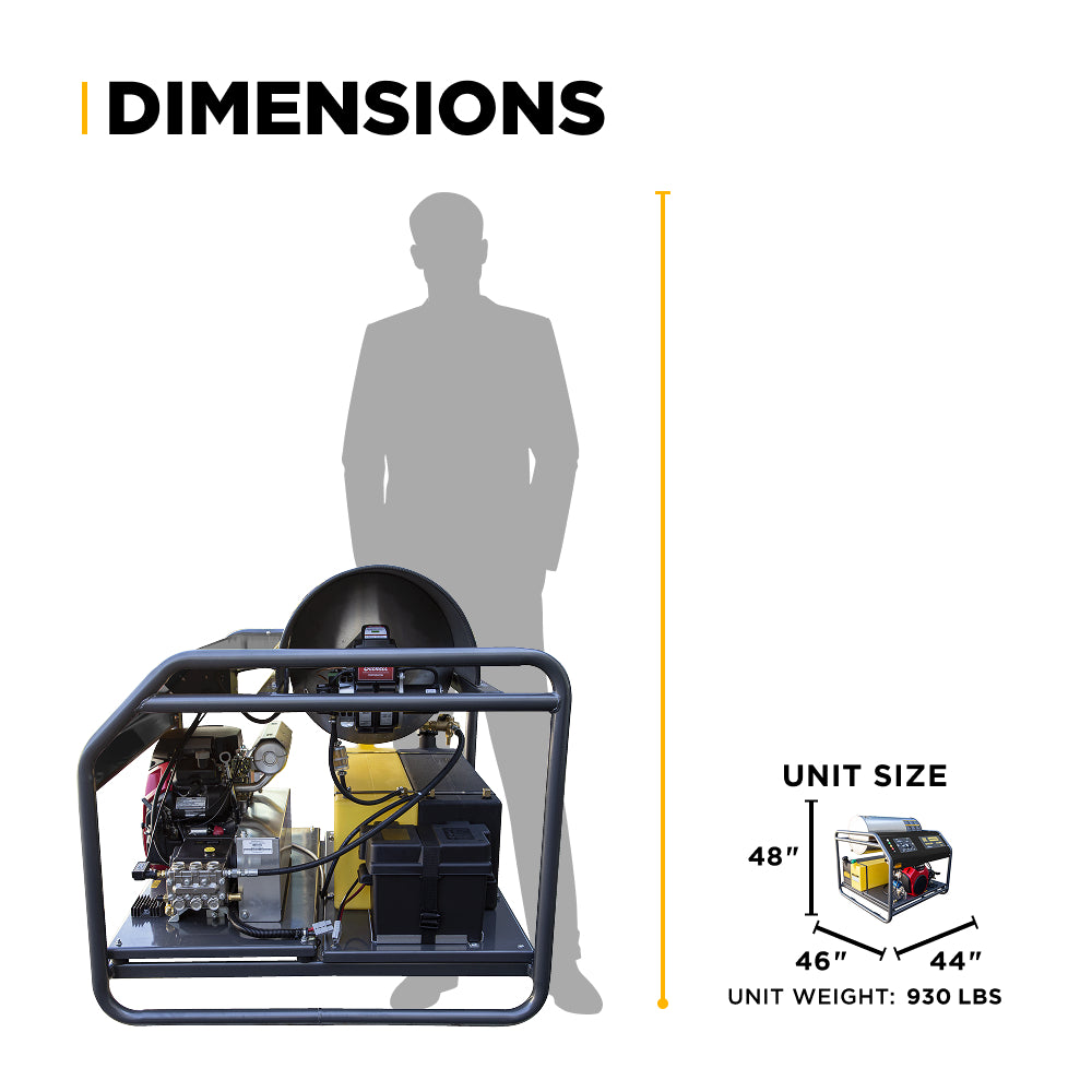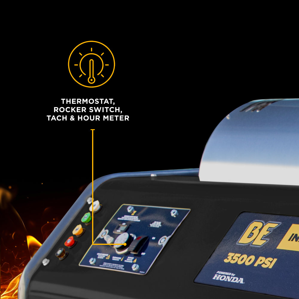 The BE Power Equipment HW3524HG12V is engineered for professionals who demand the best. Combining massive 3,500 PSI pressure with an impressive 5.6 GPM flow rate, this hot water pressure washer is designed to tackle the most demanding industrial and commercial cleaning jobs with ease. It’s powered by the trusted Honda GX690 V-Twin engine, features a belt-driven General triplex pump, and produces water temperatures up to 200°F (93°C) thanks to its 12V Beckett diesel-fired burner.