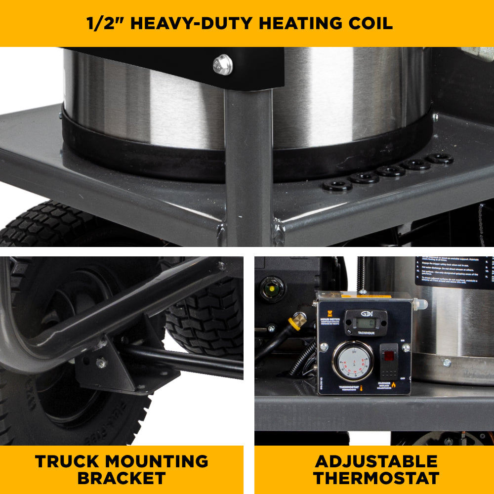 At its core is the dependable Honda GX200 196cc engine, paired with an CP Triplex commercial-grade pump, delivering a consistent 3,600 PSI at 2.5 GPM. But what truly sets this pressure washer apart is its ability to harness the cleaning power of heat — with a 12V Wayne burner, fully adjustable thermostat, and a scorching output of up to 200°F (93°C).