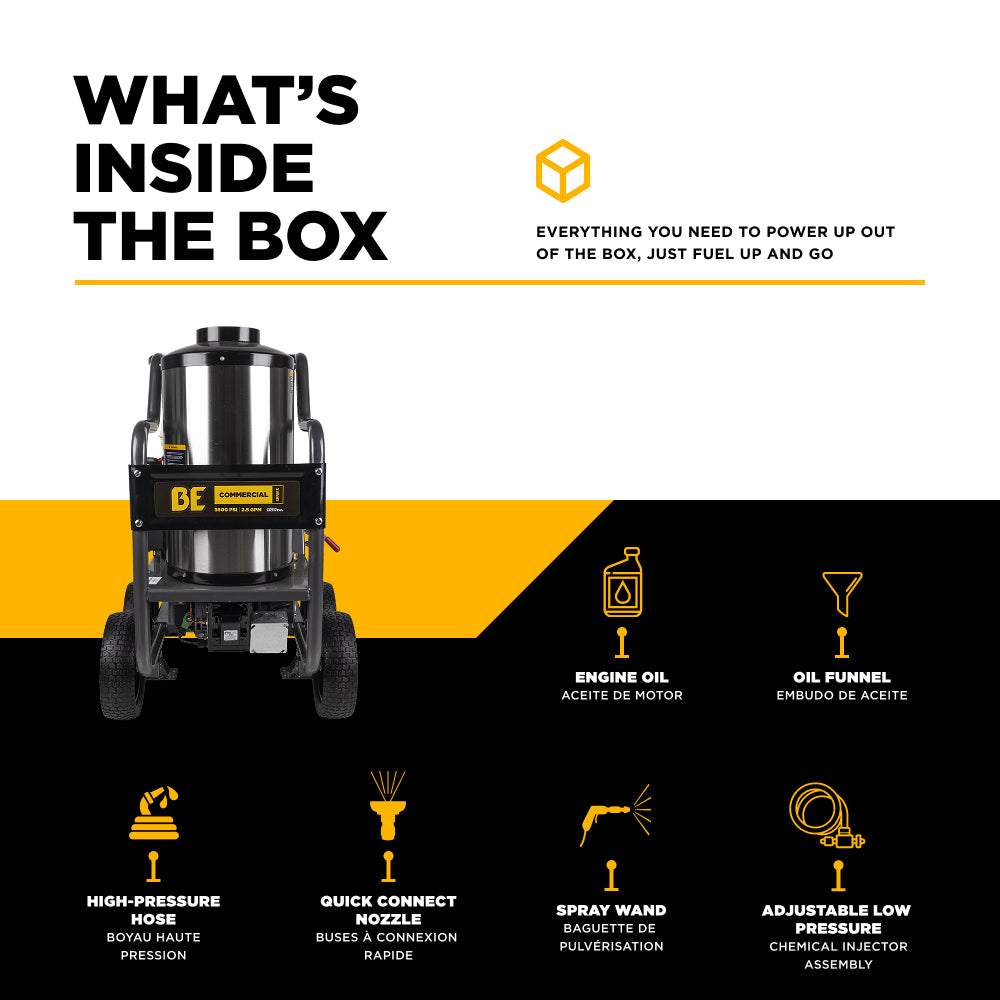 The BE Power Equipment HW3665HA isn’t just a hot water pressure washer — it’s a portable powerhouse built to perform in the dirtiest, greasiest, most punishing environments. If you’re serious about clean, and even more serious about your equipment, this is the machine that earns its spot on your truck, trailer, or worksite.