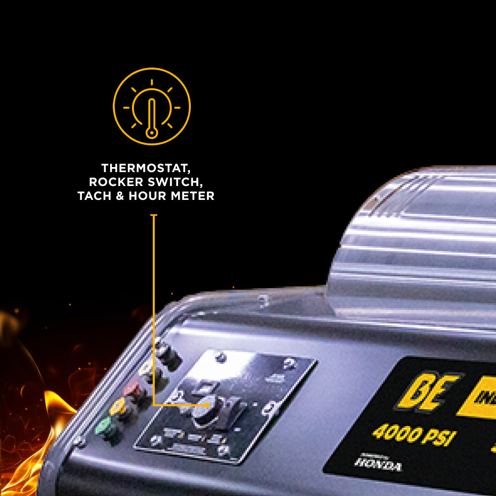 The burner system includes a rocker switch for quick activation and an adjustable thermostat so you can tailor the heat to the task. Whether you're sanitizing equipment or blasting off stubborn residue, this washer gives you full control over the temperature.