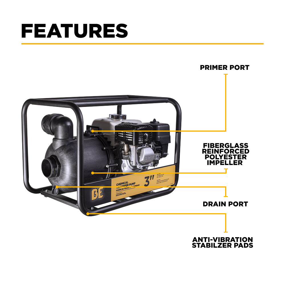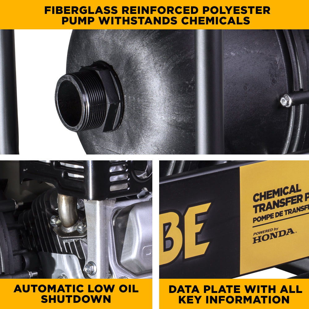 Fiberglass-reinforced polyester pump body construction withstands agriculture and industrial chemicals that would corrode aluminum pumps.
