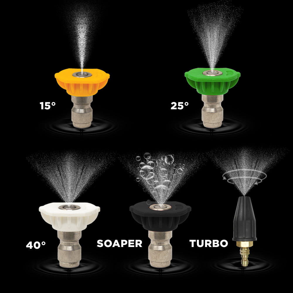 Nozzles Included: 0°, 15°, 25°, 40° + rotary turbo nozzle + high-pressure foam cannon
