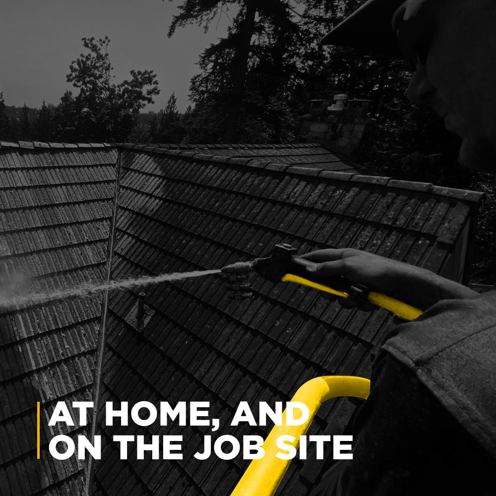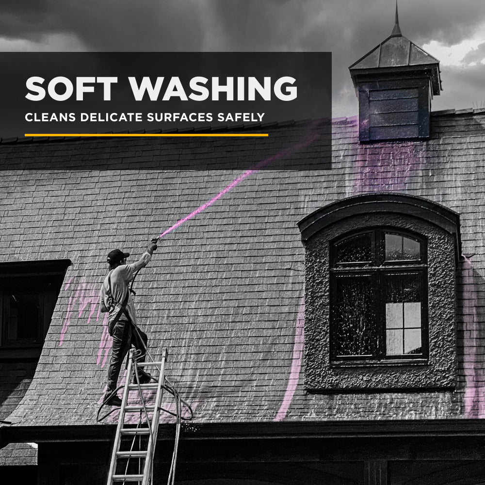The soft wash system uses low-pressure but high-volume of water mixed with specific detergents for its cleaning power. It is a gentler cleaning method that is ideal for delicate surfaces such as roofs and wood structures.