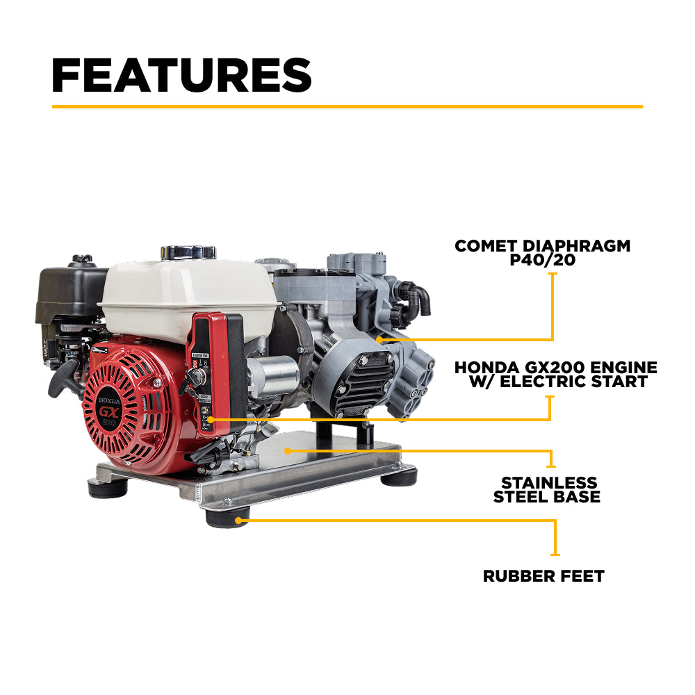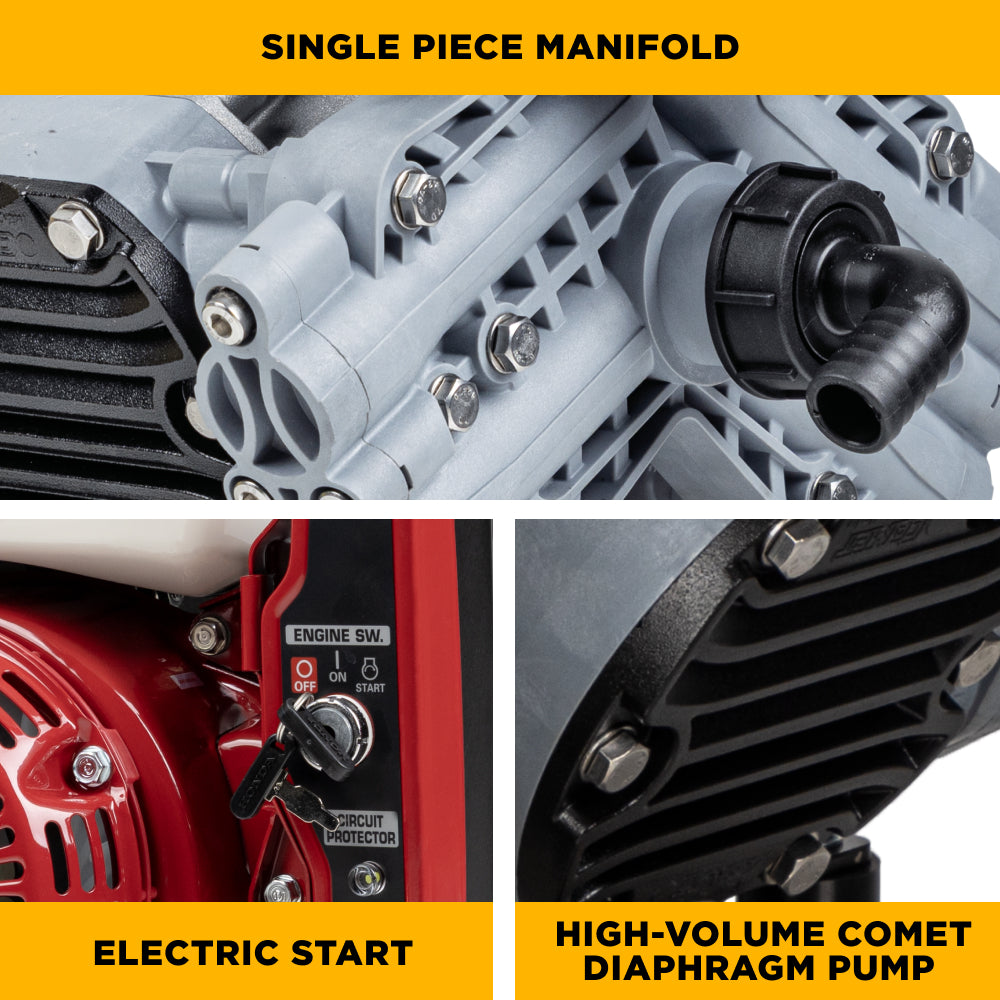 High-volume, commercial-grade Comet diaphragm pump has chemical-resistant wet parts that are compatible with aggressive soft wash chemicals.