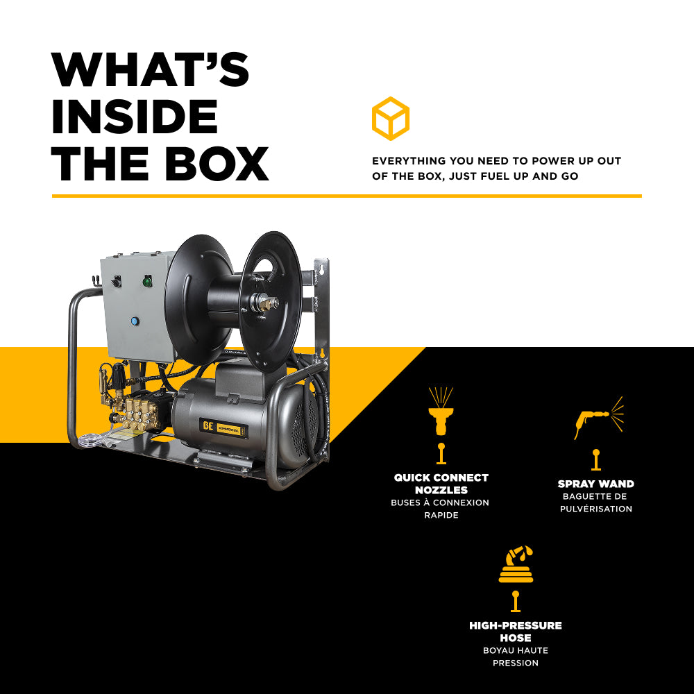 Professional Accessories Included: 50 ft. high pressure hose, insulated spray gun and wand and 5 quick-connect nozzles