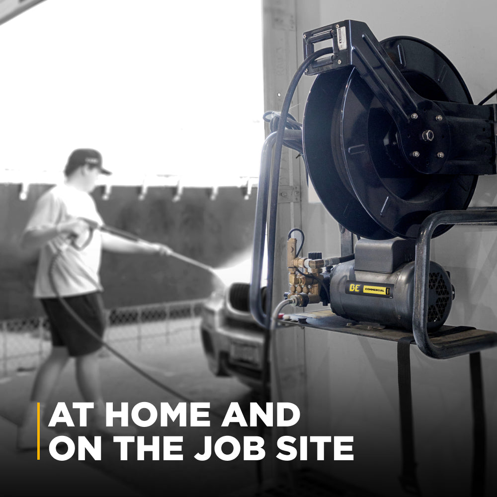 Powder coated steel frame mounts securely to a wall with storage for accessories including a hose reel for the high pressure hose.
